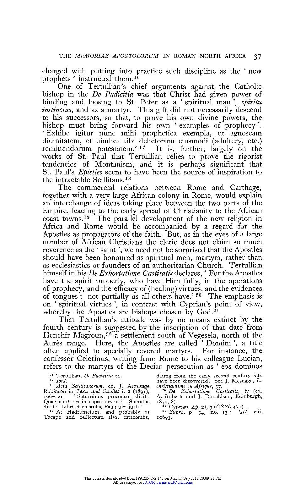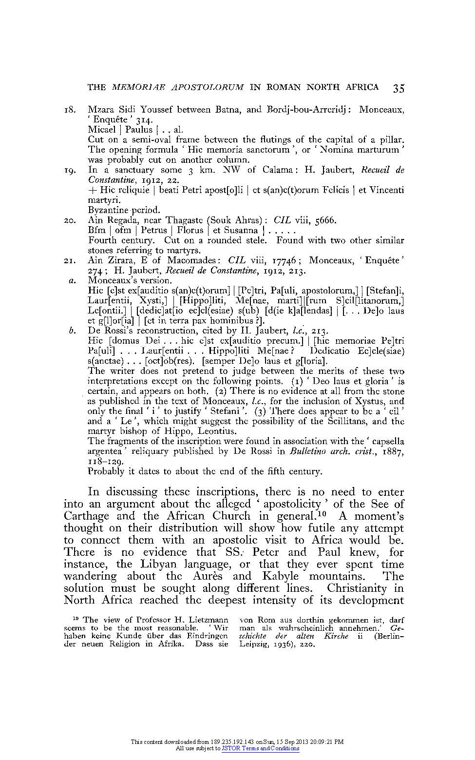 A certain number of extant inscriptions and oral traditions which still linger in remote places, as in the Djebel Nefouca,to the south of Leptis Magna and Oea, indicate that there was a time when the cult of the Apostles SS. Peter and Paul existed in Roman Africa; but the distribution of evidence, which is largely derived from the fringes of the Roman province, in Mauretania and in southern Numidia, invites the question why places so far removed from the Latin influence of the proconsular province should show such interest in the see of Rome and its founders.